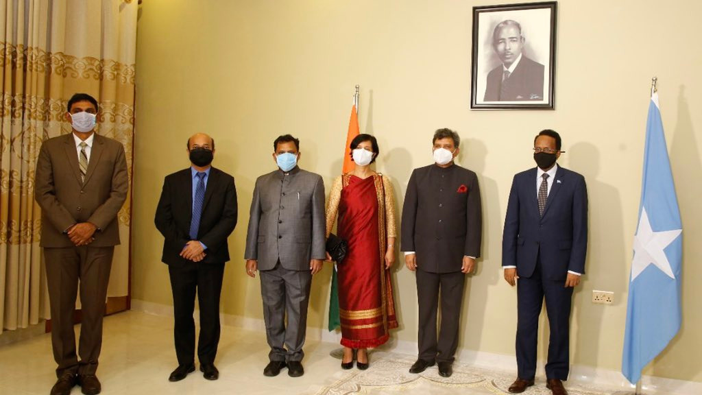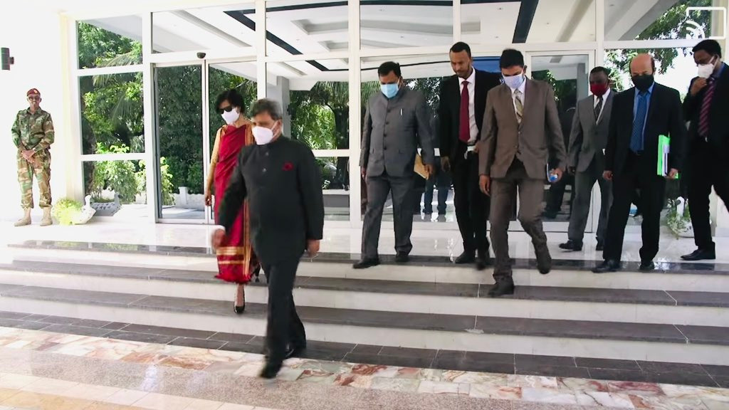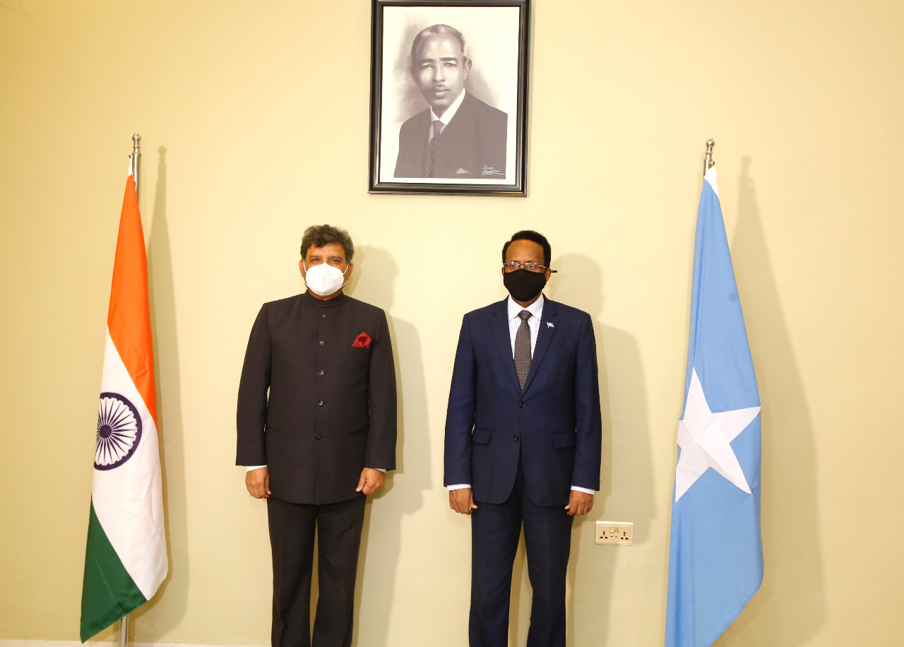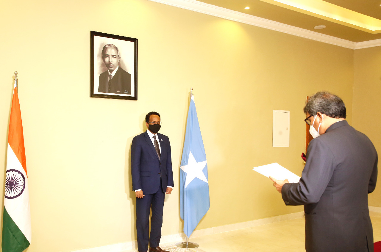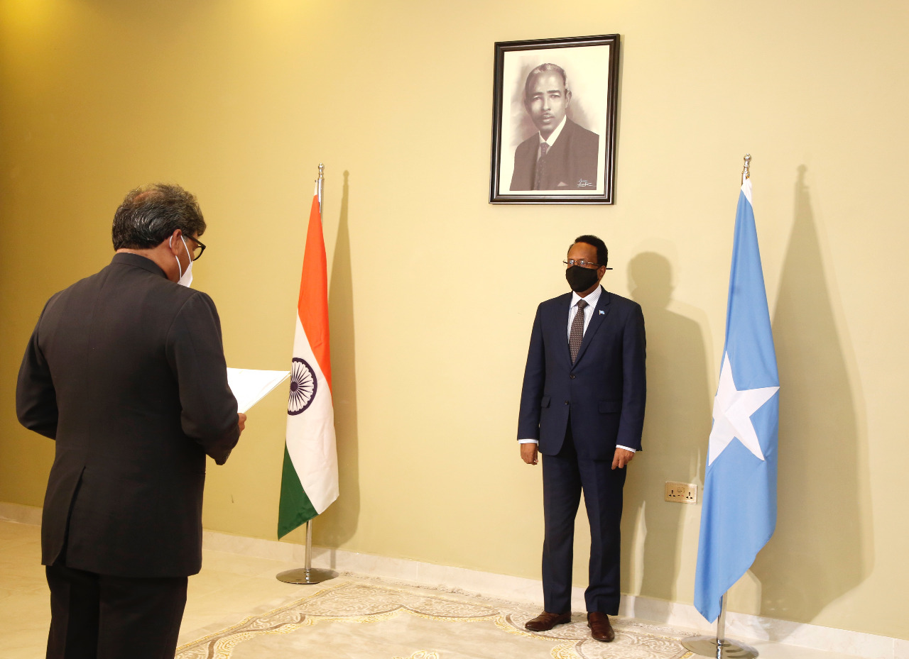 Presentation of credentials by High Commissioner Dr. Virander Paul, concurrently accredited as Ambassador of India to Somalia to President H.E. Mr. Mohamed Abdullahi Mohamed [Mogadishu, 29 May, 2021].