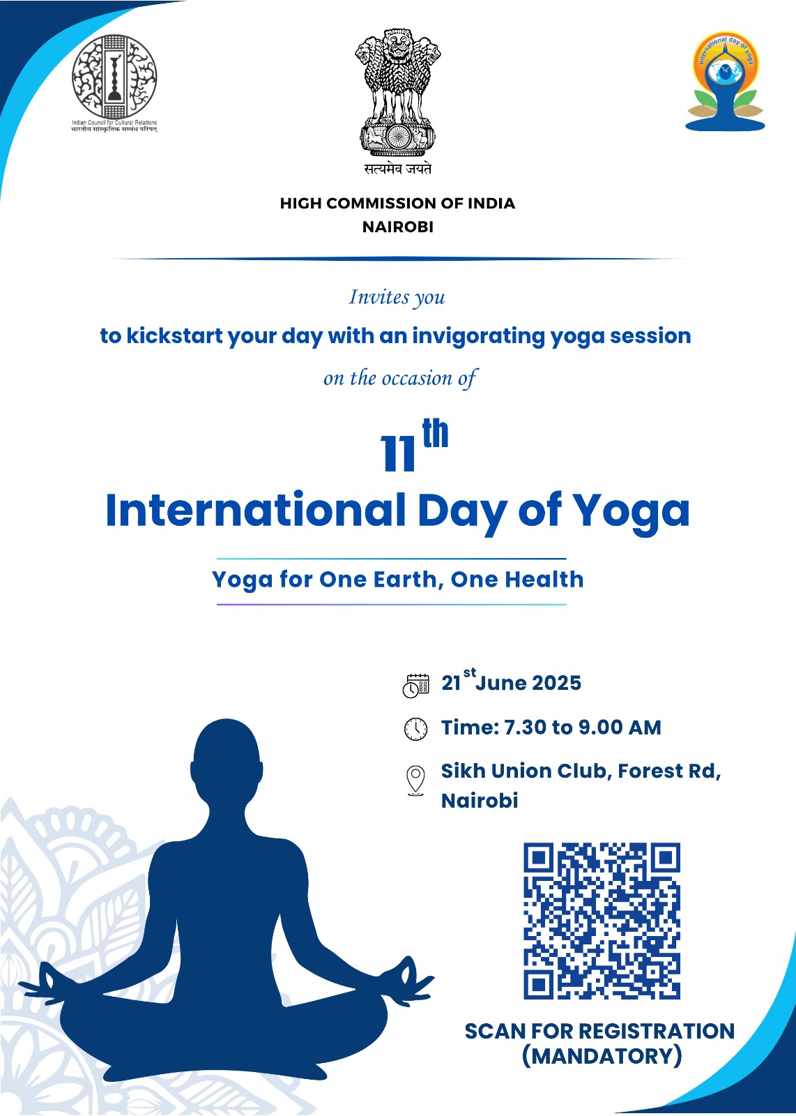 High Commission of India with the support of our partners will organize 11th International Day of Yoga at Sikh Union Club, Nairobi on 21st June, 2025 from 7:30 to 9:00 AM.