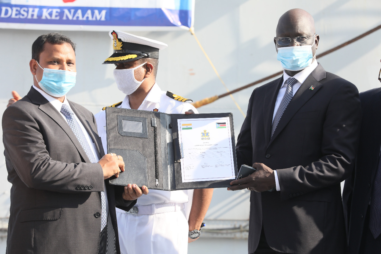 Handing over ceremony for food aid meant for South Sudan, brought by INS Airavat