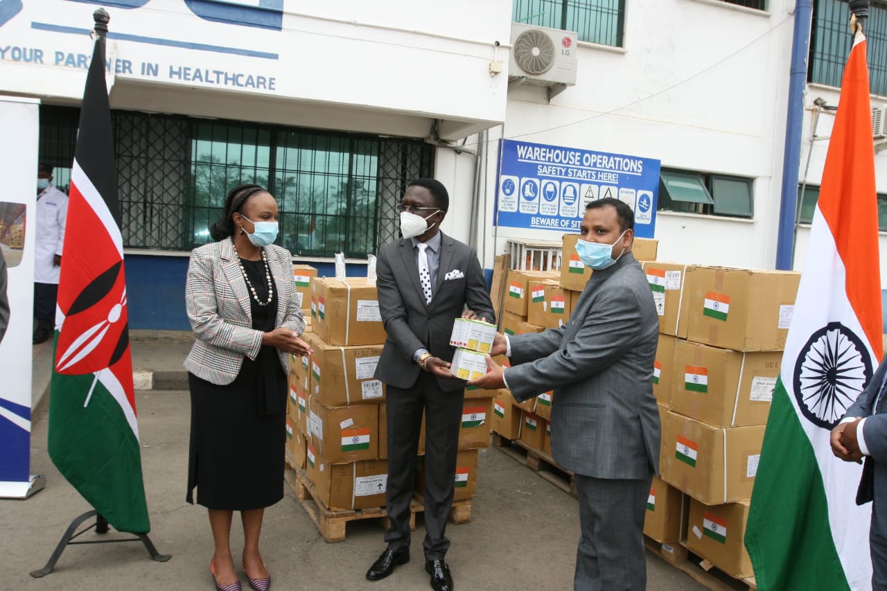 AHC Mr. Ashish Sinha handing over the consignment of medicines to CAS, Hon. Namwamba and CAS, Dr. Mwangangi on 12 August 2020