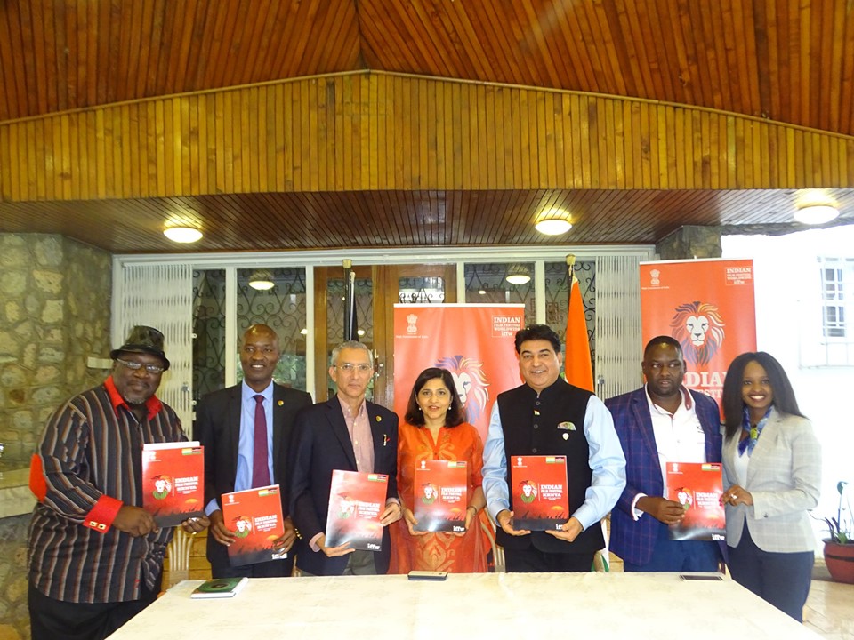 Mr. Charles Bukeko, popular Kenyan actor, Mr. Timothy Owase, CEO KFC, HC Rahul Chhabra, Madam Kavita Chhabra, Capt. Rahul Bali, Curator IFFW, Mr. Anthony Murimi, Chairman KAMP & Ms. Angela Ndambuki, Vice-Chairperson KAMP [Announcement of Indian Film Festival Kenya 2019]