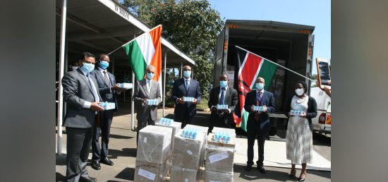 High Commissioner Mr. Rahul Chhabra handing over essential medicines worth USD 1.54 million to Dr. Rashid Aman, CAS, Ministry of Health of Kenya at Afya House, Nairobi.